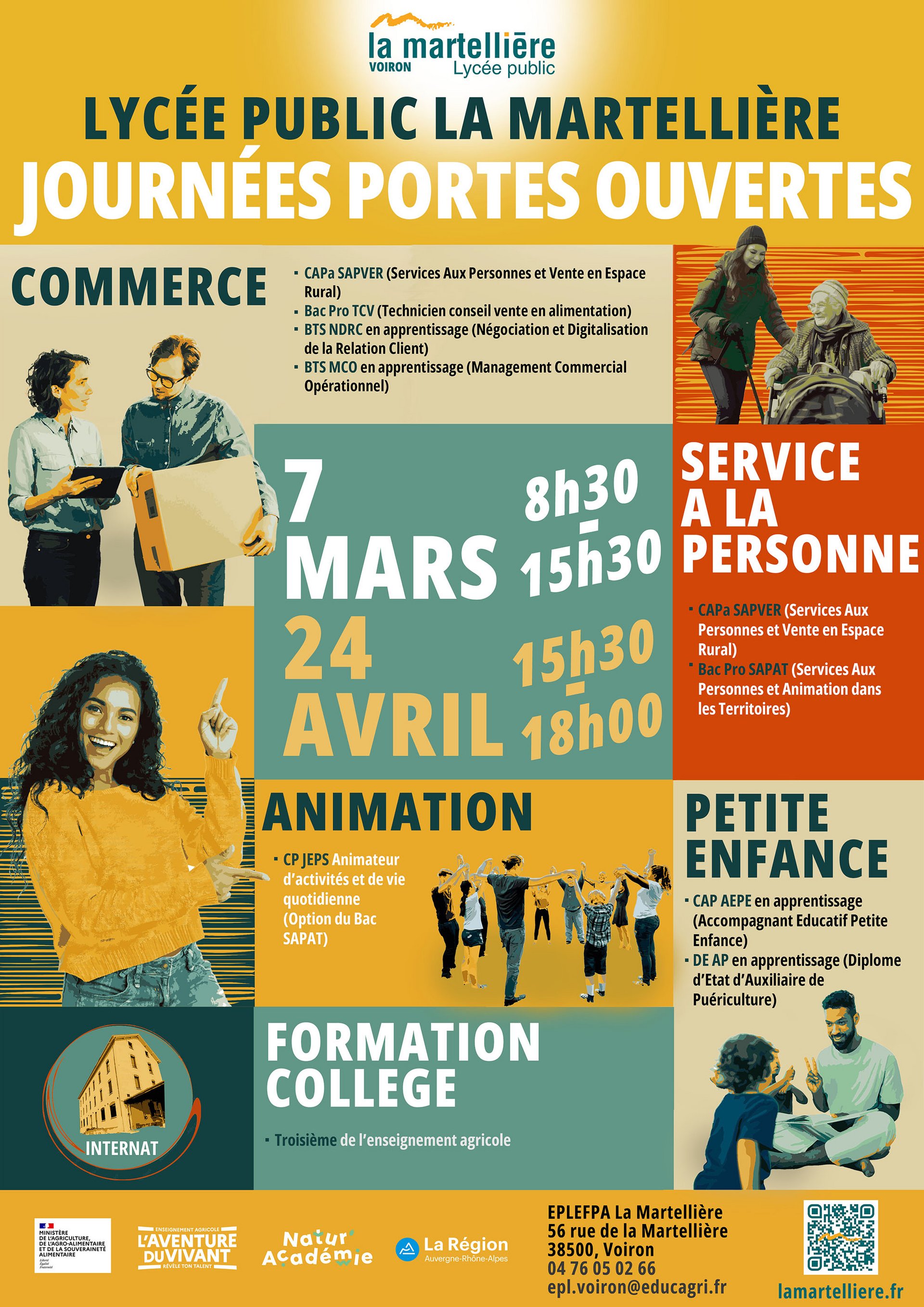 Nous aurons le plaisir de vous accueillir à La Martellière le 7 mars de 8h30 à 15h30 et le 24 avril de 15h30 à 18h30 pour nos journées portes ouvertes.
